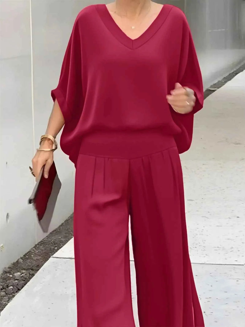 V-Neck Top and Wide Leg Pants Two-Piece Set -