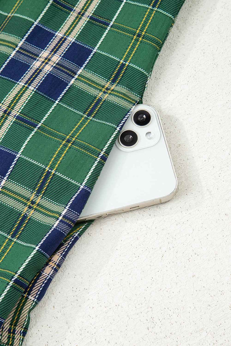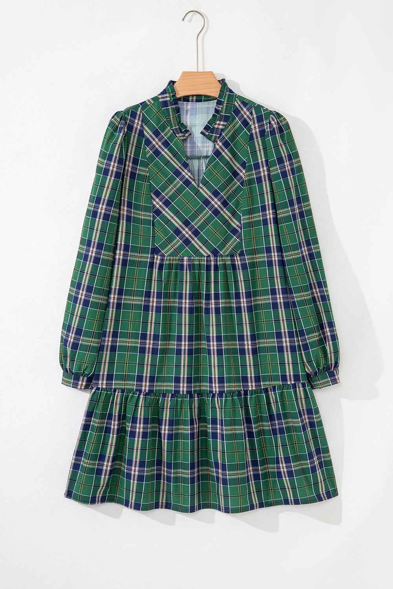 Green Plaid Print Frill Neck Long Sleeve Mini Dress -