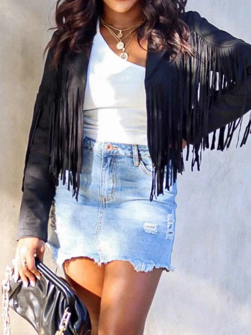 Raw Hem Animal Print Long Sleeve Denim Jacket -