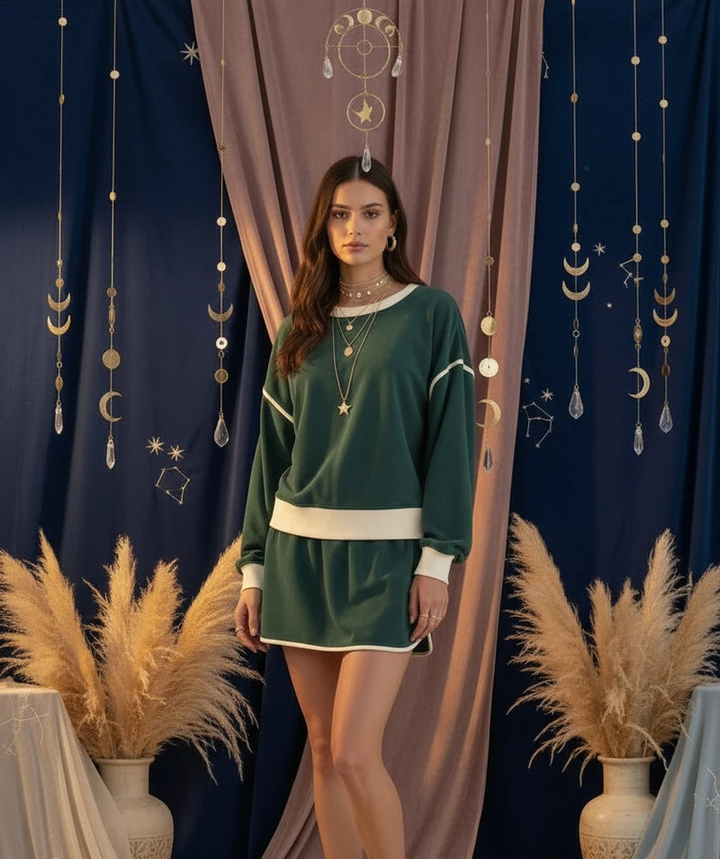 Jet Stream Solid Color Drop Shoulder Pullover Drawstring Mini Skirt 2pcs Outfit -