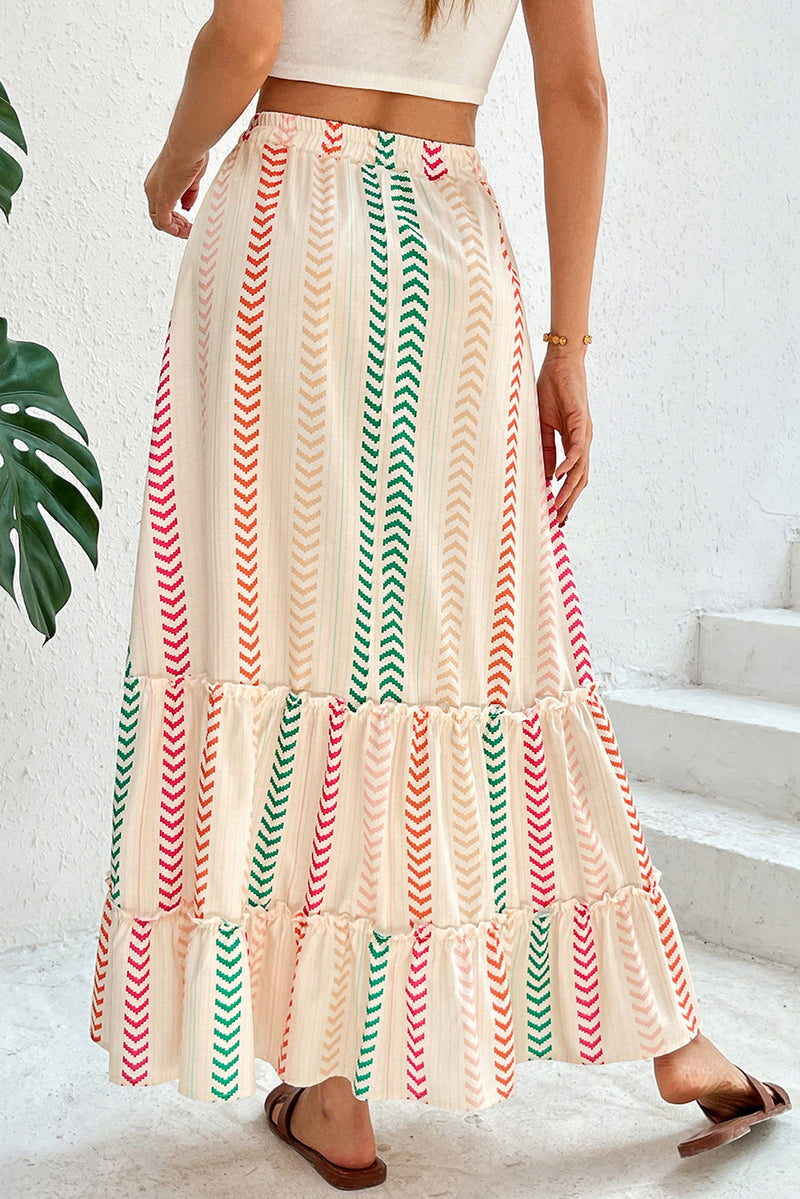 Multicolour Stripe Boho Tassel Tie Waist Tiered Maxi Skirt  -